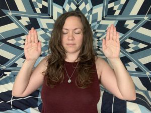To end: Inhale and bring hands up to brow point and hold until ready to exhale.
